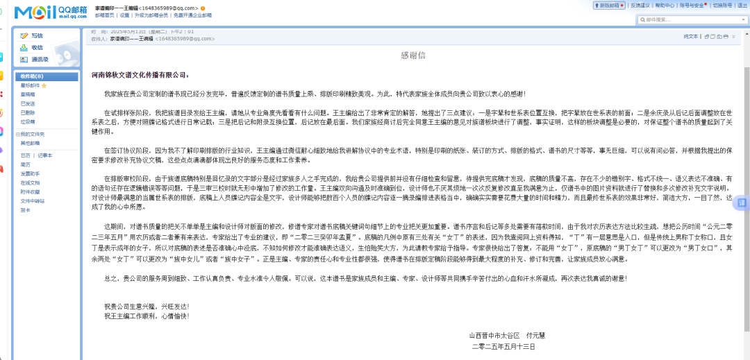 在家族文化的傳承長河中,家譜宛如一座熠熠生輝的燈塔,照亮著家族的血脈脈絡,承載著先輩的智慧與榮耀。近日,錦秋文譜家譜館收到了一封來自山西晉中市太谷區(qū)傅氏家族代表傅元慧男士飽含深情的感謝信。這封信,不僅是對我們工作的認可與肯定,更是我們前行道路上的動力與勛章。