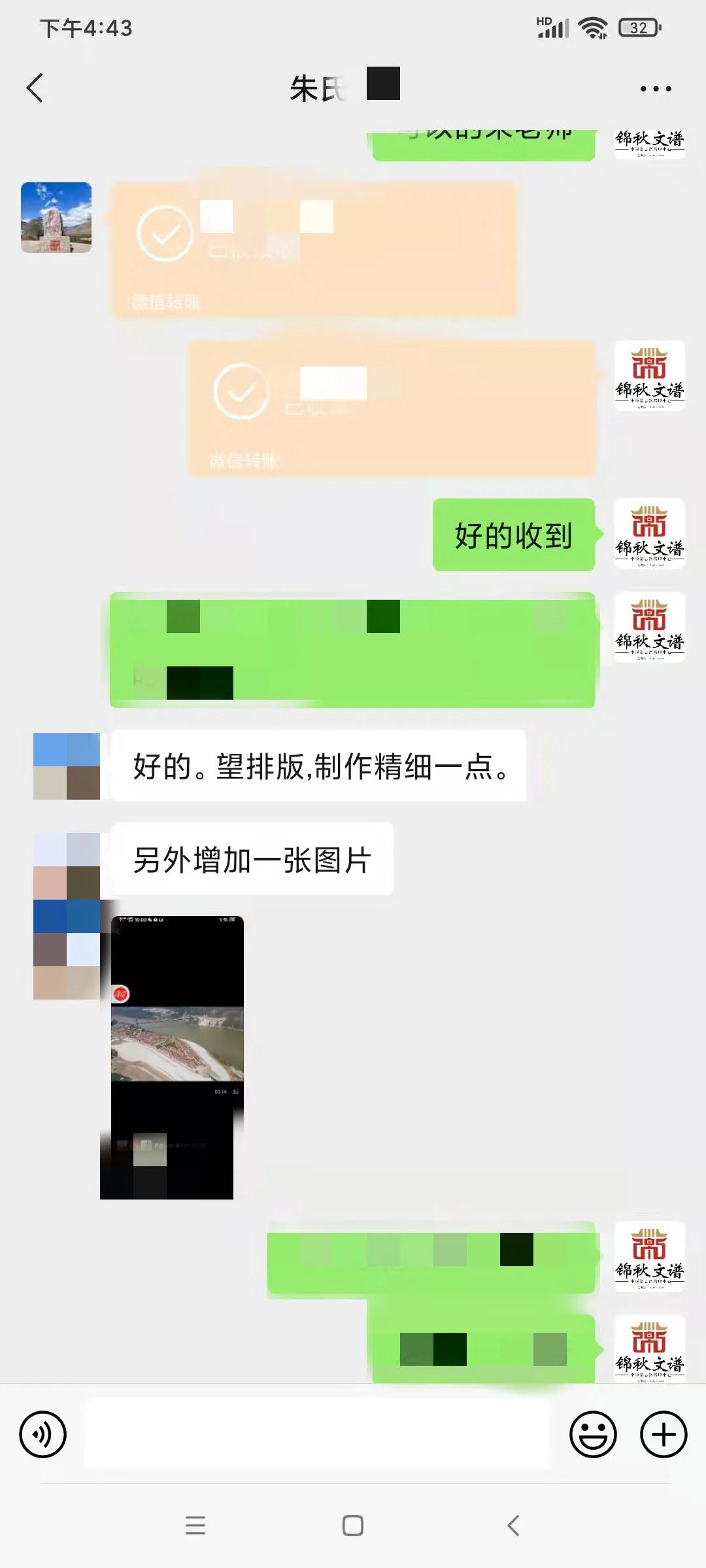 來自云南的朱氏家族,因為一直沒有專業(yè)人員的指導(dǎo)所以不敢輕易的進行修譜大業(yè),在了解到錦秋文譜后,朱老師非常認可,馬上和錦秋文譜趙編輯進行了溝通,趙編輯對于朱老師家族的情況,進行了指導(dǎo)。