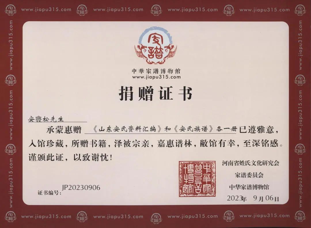 近日,山東的安豊松先生與我館取得聯(lián)系,并將《安氏族譜》和《山東安氏資料匯編》各一冊捐贈至中華家譜館收藏。我館接受了饋贈,并向安豐松先生回寄了收藏證書。