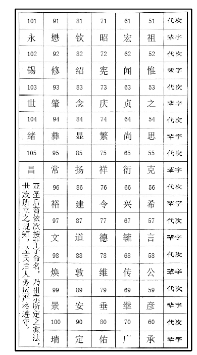 孟氏按行輩起名始于明代,朱元璋對孔、孟后裔格外優(yōu)禮。除賜給祭田、免除徭役,從明景泰年間,孟子的第五十六代孫孟希文被授予世襲翰林院五經(jīng)博士算起,從此,孟子后裔開始授世職。當(dāng)時(shí),立了「希、言、公、彥、承、弘、聞、貞、尚、胤」十個(gè)子輩(后來,為了避清高宗(乾?。坌掠X羅弘歷之諱,改「弘」、為「宏」、為避清世宗(雍正)愛新覺羅胤禎之諱,改「胤」為「衍」作為孔、孟后裔子孫的行輩字?;实鄱髻n行輩字,孟氏族眾都嚴(yán)格遵從。明崇禎年間,又立了「興、毓、傳、繼、廣、昭、憲、慶、繁、祥」十個(gè)字輩。清同治四年(1865),又立了「令、德、維、垂、佑、欽、紹、念、顯、揚(yáng)」十個(gè)字輩。民國九年(1920年)冬,孔子76代世襲衍圣公孔令貽,和孟子73 代世襲五經(jīng)博士孟慶棠,又?jǐn)M續(xù)了二十個(gè)世次行輩字,即「建、道、敦、安、定、懋、修、肇、彝、常、裕、文、煥、景、瑞、永、錫、世、緒、昌?!箞?bào)當(dāng)時(shí)的北洋政府內(nèi)務(wù)部批準(zhǔn)、并咨行各省縣布告周知。
