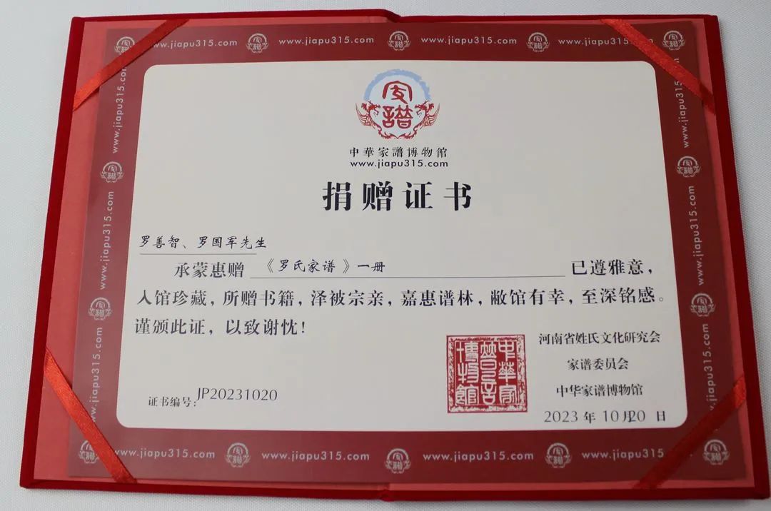 日前,河南省鄭州市羅善智、羅國軍先生與錦秋文譜中華家譜館的張編輯取得聯(lián)系,并親自向我館捐贈(zèng)《羅氏家譜》一冊(cè)。張編輯接受了饋贈(zèng),并回贈(zèng)了收藏證書。