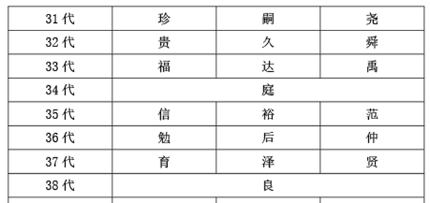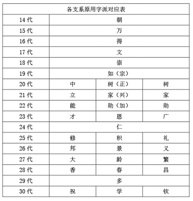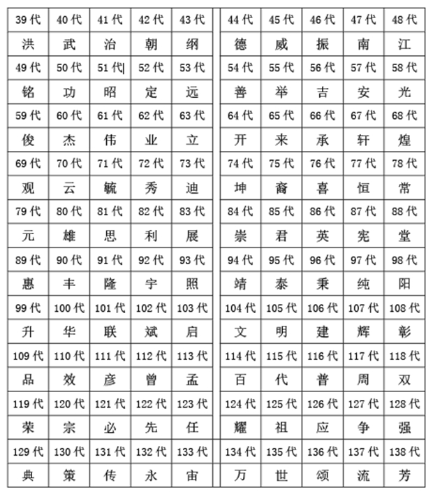 根據(jù)宣威永安朱姓族譜1946年和1994年兩次編續(xù)的傳承字譜連接一覽表及墓碑考證(14—38代)對應(yīng)如下:傳承字譜是家族識別倫輩、尊祖敬宗的通用制度。望廣大宗親為子孫后代取名時自覺執(zhí)行。