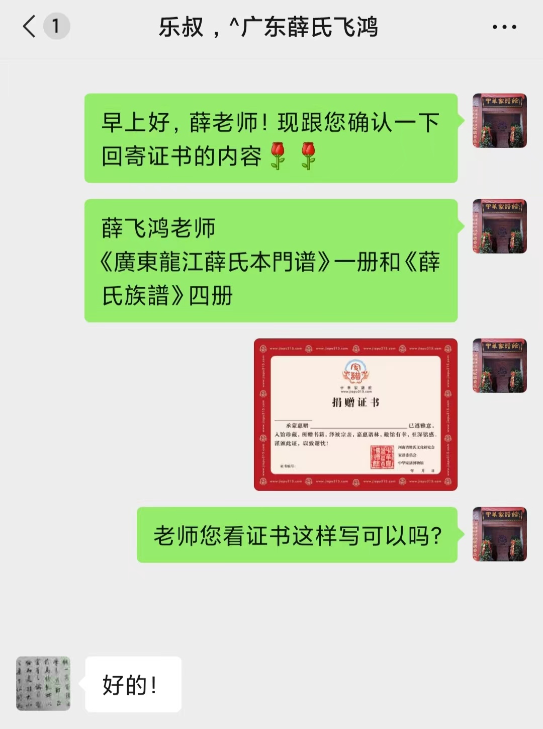 日前,薛飛鴻先生向錦秋文譜|中華家譜館捐贈(zèng)《廣東龍江薛氏本門(mén)譜》一冊(cè)和《薛氏族譜》四冊(cè)。我館張編輯接受了饋贈(zèng),并向老師回寄了收藏證書(shū)。