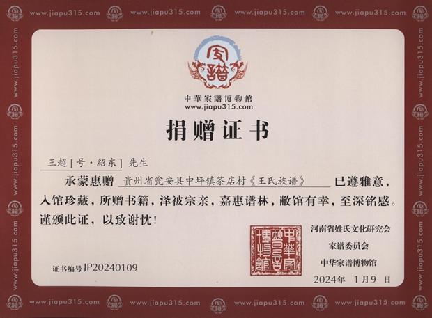 由錦秋文譜|中華家譜館承印的貴州省甕安縣中坪鎮(zhèn)茶店村《王氏族譜》已成功付梓一年有余。近日,該家族成員王超[號(hào)·紹東]先生看到了我們的招募捐譜文章,隨即聯(lián)系王編輯,并向我館捐贈(zèng)了這本《王氏族譜》。當(dāng)天就回寄了收藏證書以示感謝。