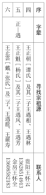 尋根主題詞:甕安[金房及茶店]王氏,王之倫[胡氏]上源及同宗,“正”字及“遇”字輩諸公及后裔同宗。