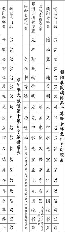 順陽李氏族譜第十纂新老字輩世系對照表