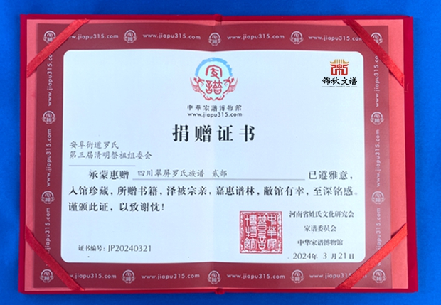 日前,我館收到了來自四川翠屏安阜街道羅氏第三屆清明祭祖組委會(huì)的捐贈(zèng),我館在收到捐贈(zèng)的第一時(shí)間回寄了收藏證書。