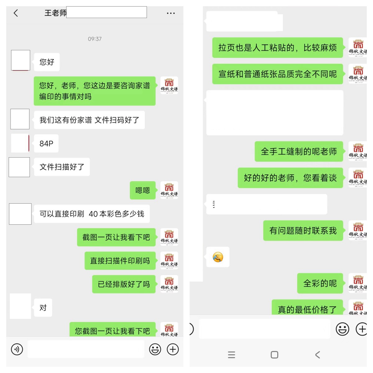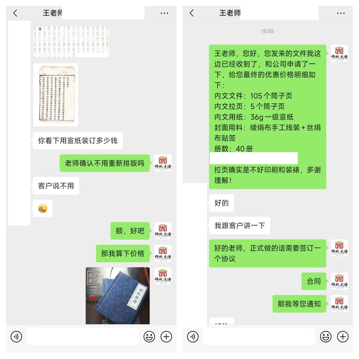 基于此目的,王氏家族和我館王編輯取得了聯(lián)系,在王編輯仔細(xì)翻閱了一頁掃描件后,便迅速結(jié)合客戶實(shí)際情況計(jì)算出了宣紙印刷的價(jià)格。宣紙不僅承載著中華文化的厚重底蘊(yùn),更能凸顯出家譜的莊重與典雅。王氏家族對于價(jià)格表示十分滿意,并期待著早日看到家譜印刷成品的那一刻。