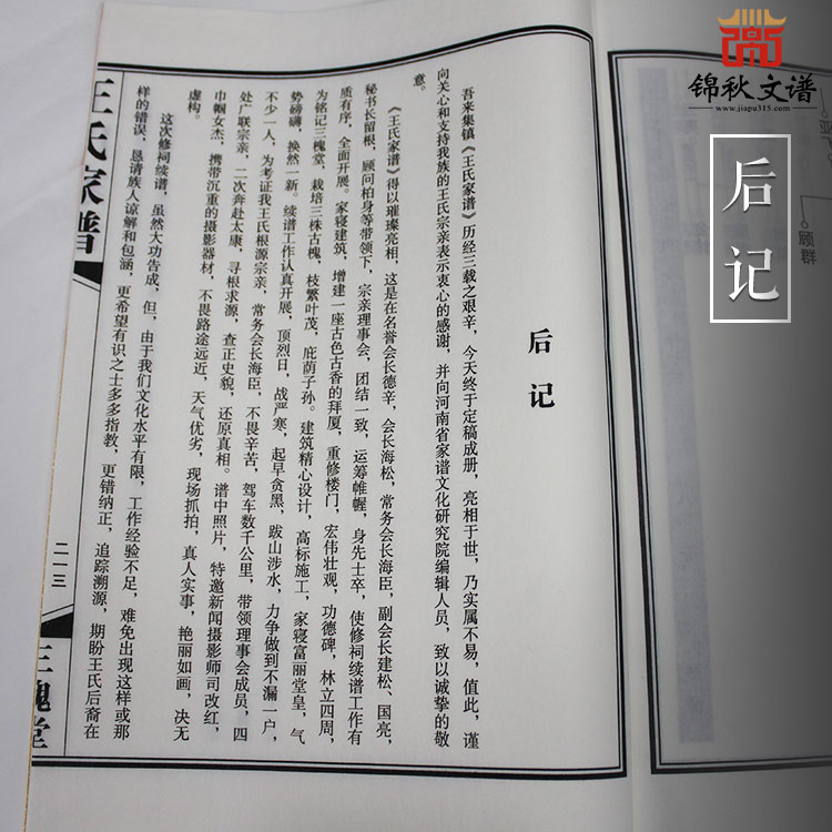 水有源樹有根修祠續(xù)譜是吾王氏家族悠久之傳統(tǒng),也是人類血脈傳承的象征,更是吾王氏家族繁衍生息的真實(shí)記載,還是吾柿園王后裔修孝修德修善偽一種體現(xiàn)。這次修祠續(xù)譜是二〇一九年十二月發(fā)起,發(fā)起人有王海松、王建松、東王溝王留根和一九九三年修祠續(xù)譜老會(huì)長(zhǎng)王海臣,經(jīng)商議成立修祠續(xù)譜理事會(huì)、推舉王海松任會(huì)長(zhǎng)、王海臣任常務(wù)會(huì)長(zhǎng)、王建松、王國(guó)亮任副會(huì)長(zhǎng),王留根任秘書長(zhǎng),王國(guó)強(qiáng)任副秘書長(zhǎng)。顧向王柏身、王寶貴、成員王志平、王國(guó)長(zhǎng)、王國(guó)獻(xiàn)、王建國(guó)、王玉春、王建軍、王留卿、王福欽、王建濤、王留燦、王建成、王小錄。成立財(cái)務(wù)小組、會(huì)計(jì)王建成、出納王海臣、做到了收支透明、賬目公開,不亂花一分錢,真正做到把每一分錢都用到修祠續(xù)譜上。在會(huì)長(zhǎng)帶領(lǐng)下開始計(jì)劃:(一)家祠修繕新蓋一個(gè)拜祖大廳,內(nèi)設(shè)香爐,仿古建筑基礎(chǔ)地梁角柱圈梁,正前臉上方掛三槐堂鎏金大字、兩邊廊柱鎏金對(duì)聯(lián),水泥地平、上房要撒水坡,前臉房脊室內(nèi)要粉刷批白,門樓要重新建高大門樓,院內(nèi)水泥硬化、亭子重新整修,柱子大門重新噴漆棗紅色。(二)制訂集資方案:①?gòu)V泛發(fā)掘王氏后裔知名人士、企業(yè)家、捐款一萬(wàn)元及以上者全家福照片上譜、送家譜一本、功德碑獨(dú)立一通以此留念;捐款五千元及以上者,全家福照片上譜、送家譜一本、名字刻在千元碑上,以此留念;捐款五千元以下一千元及以上者,夫妻合影上譜、名字刻在千元碑上,送家譜一本。②對(duì)現(xiàn)居柿園王上下河的后裔按現(xiàn)有人口每人收一百元進(jìn)行集資。③對(duì)遷出柿園王的后裔集資收取辦法安每家這次上譜人口男女、媳婦、女孩平等原則,每人收取一百元;對(duì)個(gè)別經(jīng)濟(jì)條件確實(shí)困難的,報(bào)請(qǐng)理事會(huì)討論下調(diào)幅度,個(gè)人不得擅自答復(fù)。各地捐資情況上功德碑,上家譜集資情況表,以示紀(jì)念。此計(jì)劃自二〇二〇年元月五日制定并開始實(shí)施,經(jīng)組織策劃于本月十五日開始執(zhí)行、兵分四路、每路三人一組分東西南北四個(gè)方向駕車分頭通知。王氏族人這次修祠續(xù)譜從開始宣傳到理事會(huì)制訂修祠續(xù)譜方案及集資辦法做到了家喻戶曉人人皆知、經(jīng)一周努力,縣內(nèi)縣外禹州、登封、汝州、伊川、滎陽(yáng)等地全都通知到位。(三)時(shí)至農(nóng)歷二〇二〇年春節(jié),武漢突然爆發(fā)疫情、各地實(shí)行嚴(yán)防死守,交通停運(yùn),足不出戶,嚴(yán)格阻斷疫情傳播,吾理事會(huì)工作被迫停滯,理事會(huì)采用領(lǐng)導(dǎo)帶頭捐款,動(dòng)員積極分子跟隨査找知名人士上門做工作,經(jīng)過不懈努力卓有成效,征集資金十萬(wàn)余元,為二〇二二年祠堂修建奠定了基礎(chǔ)。農(nóng)歷二〇二二年二月十八日大吉大利動(dòng)工修建,經(jīng)過兩個(gè)半月的緊張施工,麥?zhǔn)涨盎就旯?,秋后又組織精干力量開始續(xù)譜工作。續(xù)譜工作是精細(xì)而繁瑣的工作,上掛要看準(zhǔn),下連要弄清,稍有不細(xì)心就會(huì)出錯(cuò)、工作人員不辭辛苦,南下許昌禹州,北上滎陽(yáng)、西至登封、汝州、伊川沿著崎嶇的山路走家串戶,苦口婆心做耐心細(xì)致的工作,頭頂炎炎烈日冒著四十度高溫,汗流浹背,經(jīng)過兩個(gè)多月的積極努力終于達(dá)到了預(yù)期目的、現(xiàn)已跟印刷廠達(dá)成排版印刷協(xié)議。