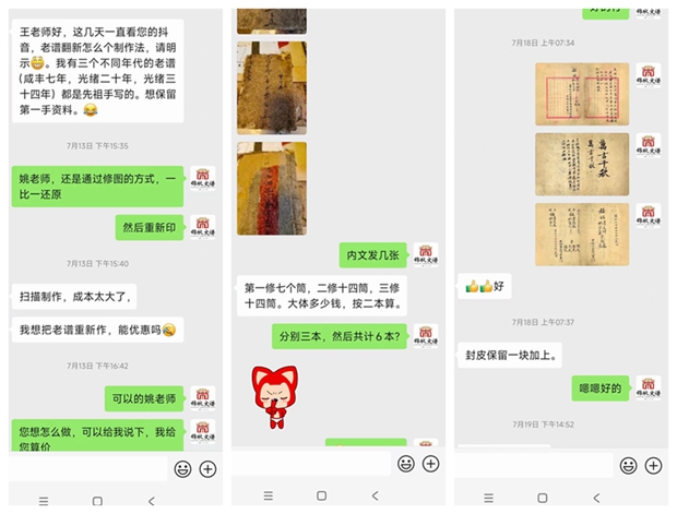 七月的炎夏,姚老師再次向王編輯投來了詢問的目光。原來,他一直關注著錦秋文譜在抖音上的動態(tài),想要了解老譜翻新的具體工藝。姚氏家族珍藏的咸豐七年、光緒二十年、光緒三十四年的三本老譜,均為先祖親筆書寫,承載了家族的厚重歷史。王編輯針對這些珍貴文獻,提出了細致入微的修復方案,并先行設計修復了部分老譜圖,既恢復了其歷史原貌,又保留了歲月的痕跡。修復后的樣品讓姚老師贊嘆不已,最終放心地將姚氏歷代老譜的翻印工作全權托付給了錦秋文譜。