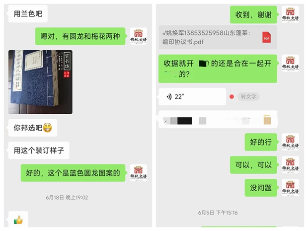 在五月的晨曦中,山東蓬萊的姚老師與錦秋文譜的王編輯締結了合作的紐帶。經過深入的交流,姚氏家族決意續(xù)修家族譜書,計劃先行編纂二十頁內容,并印制十二冊,以承續(xù)家族記憶。在王編輯一對一的精心指導下,姚老師關于序言撰寫與修譜的種種疑云得以消散。經過細致的核算,姚老師選擇了藍色梅花、古式線裝的裝幀方式,鄭重地簽下了家譜編印的合作協(xié)議。