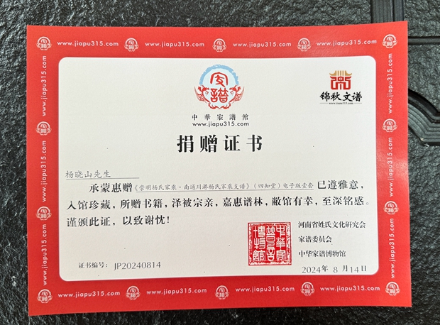 近日,于我們公眾號上輕舞的一則捐譜招募雅文,悄然間觸動了楊曉山先生溫厚的心弦。他慷慨解囊,特地將珍藏的《崇明楊氏家乘·南通川港楊氏家乘支譜》(四知堂)之電子版瑰寶,無私地捐贈于我館。此舉猶如古木逢春,為家族文化的傳承添上了濃墨重彩的一筆。