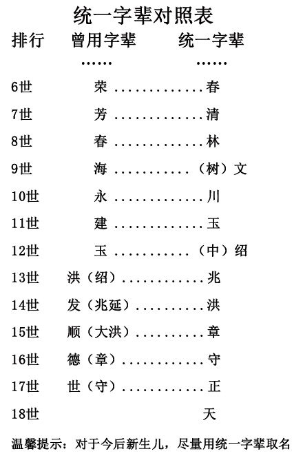 (注:現(xiàn)將原用三種排行作如下統(tǒng)一:排行三中的大字輩與排行二中的洪字輩統(tǒng)一為章字輩。原用章字輩和德字輩統(tǒng)一為守字輩,依次類推。)