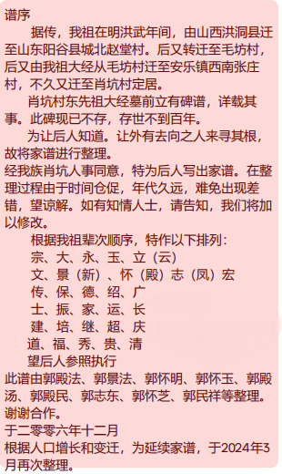 求助信息:我想聯(lián)系郭氏的人,想把我們村上的家譜再向上找!山東陽谷、聊城等附近的郭氏人員看到可與我們聯(lián)系。肯請各界人士給予幫助,提供有關(guān)信息為謝!