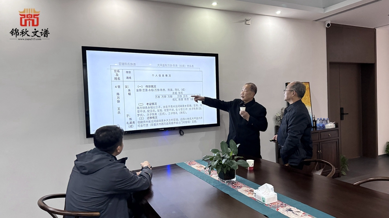 他們就近取譜,細(xì)細(xì)品鑒著宣紙彩頁與古譜紙彩頁之間的微妙差異以及老譜與新譜融合的效果。隨后,雙方就《官塘陳氏族譜》的脈絡(luò)展開了深入的交流與探討,每一個(gè)細(xì)節(jié)都如同家族史上的璀璨星辰,熠熠生輝。
