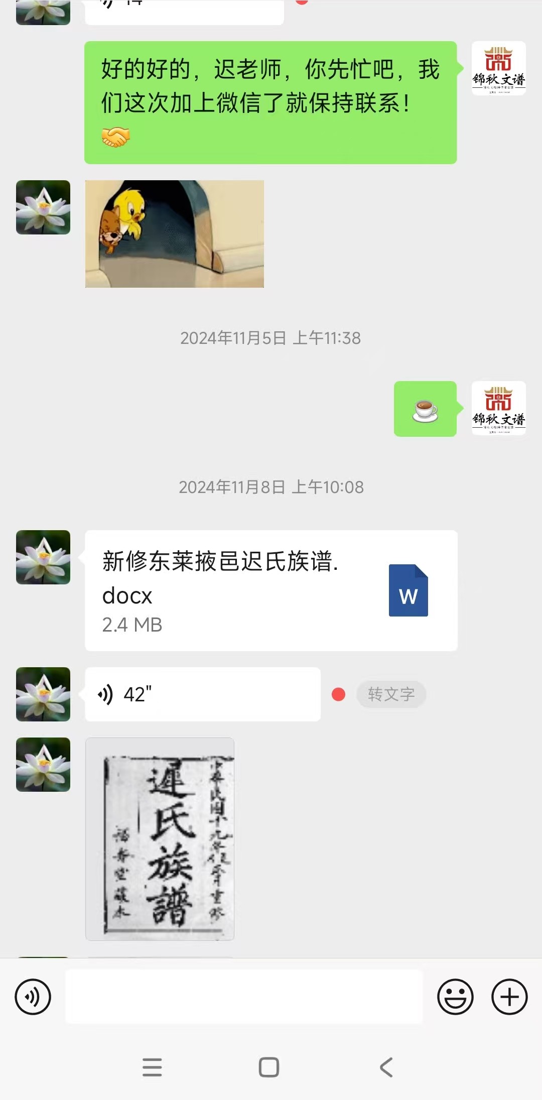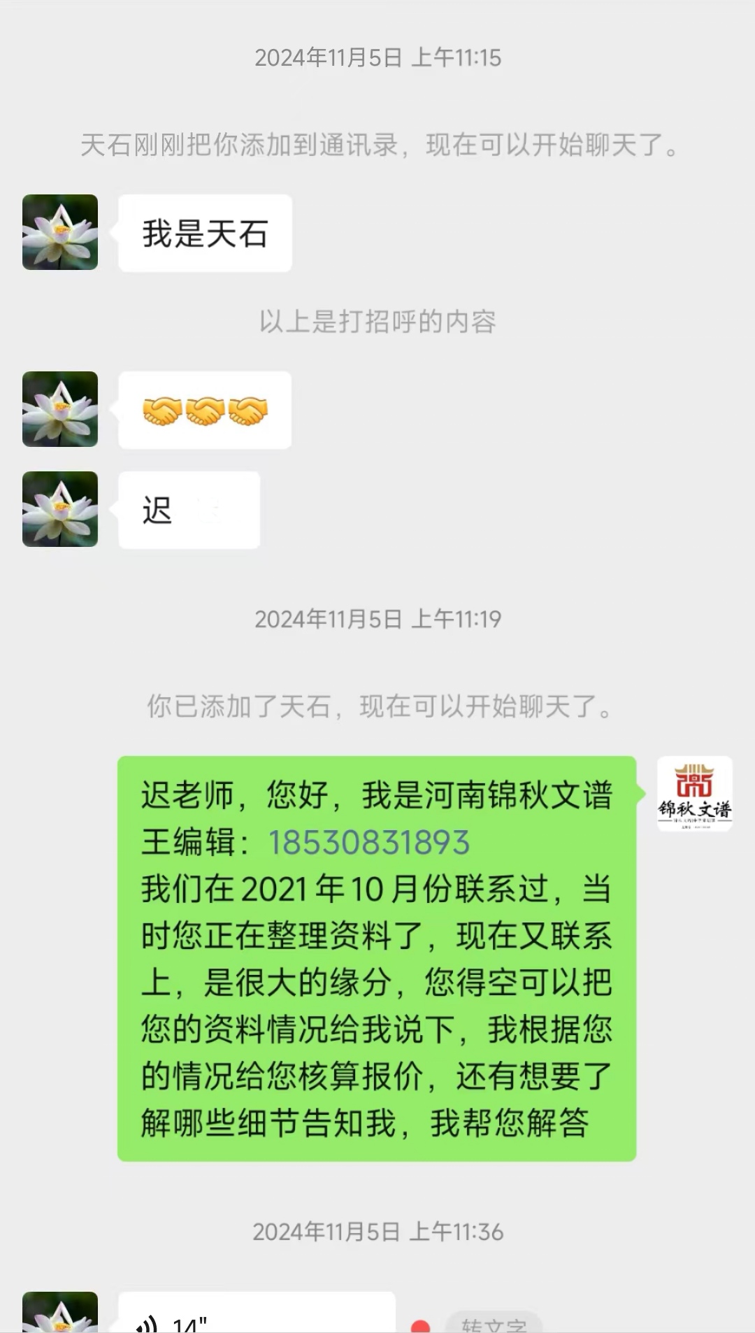 早在2021年10月,遲氏家族便與錦秋文譜家譜館有過(guò)聯(lián)系,那時(shí)的交流如同埋下的一顆種子。時(shí)隔三年,遲老師再次聯(lián)系上了錦秋文譜家譜館的王編輯,這一聯(lián)系,讓族譜編印的夢(mèng)想重新煥發(fā)生機(jī)。三年間,遲氏家族全力以赴,四處奔走,收集整理家族資料,每一份資料都凝聚著家族成員的心血與對(duì)家族歷史的敬重。經(jīng)過(guò)不懈努力,家族資料終于整理得差不多了,這也為后續(xù)的族譜編印奠定了堅(jiān)實(shí)基礎(chǔ)。
