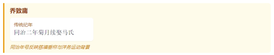又如,《晉商喬氏宗譜》記載:“喬致庸,同治二年(1863 年)續(xù)娶馬氏”?!巴巍蹦晏枌?yīng)的是慈禧太后垂簾聽政初期,此時(shí)喬家正通過票號業(yè)務(wù)與清廷形成利益綁定。若僅標(biāo)注“(1863 年)”,后人難以將“同治二年”與“洋務(wù)運(yùn)動萌芽期”“山西票號擴(kuò)張期”等歷史背景關(guān)聯(lián)起來,家族重要事件的時(shí)代坐標(biāo)被簡化為冰冷的數(shù)字,歷史語境的豐富性蕩然無存。