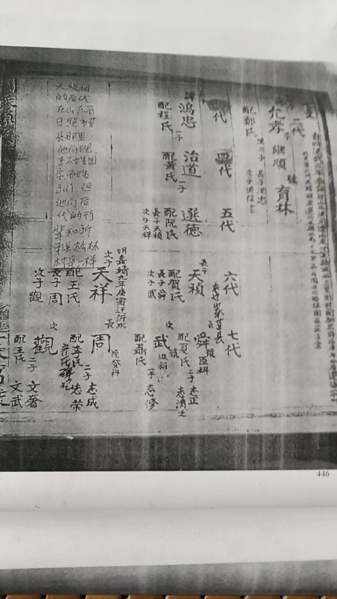考據(jù)《國氏康乾總譜七支系》,可知臻公為二門天祥公五世孫,此門袓系為選德公→天禎,天祥→禎公子周,觀→觀子文奢,文武,文明