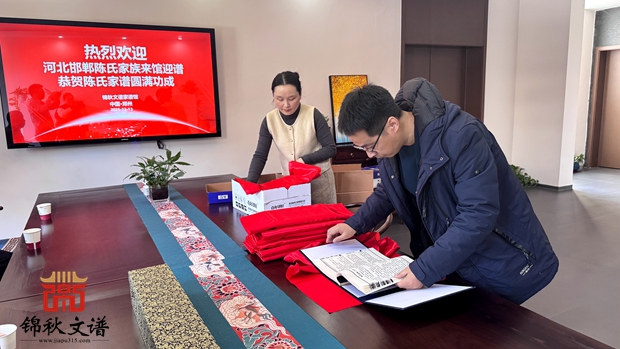 儀式伊始,陳氏家族代表依傳統(tǒng)禮序,以紅色棉布悉心包裹新譜,象征吉祥與傳承。隨后,族中負(fù)責(zé)人對(duì)譜書進(jìn)行細(xì)致抽查,從印刷質(zhì)量、裝幀工藝到內(nèi)容編排,均表示“十分滿意”。家譜掛軸與定制譜盒亦經(jīng)現(xiàn)場(chǎng)查驗(yàn),其工藝與設(shè)計(jì)獲得一致好評(píng)。