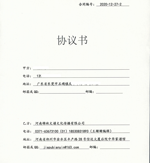 廣東胡老師在網(wǎng)上找了幾個看起來不錯的廠家,各自加了他們的微信,有的一聽做50套(函套盒),就愛答不理的,只有錦秋文譜王編輯不耐其煩的為其講解制作流程,需要收集的資料、世系圖種類、格式、排版等問題。幾個月下來,胡氏家譜資料整理的差不多,確定要黃色圓龍綾絹布、貼絲絹布簽條,使用一級宣紙,右裝訂、又詢問了幾家價格,付款方式以及交貨方式等情況,當即與錦秋文譜在線上簽訂了家譜制作合同!