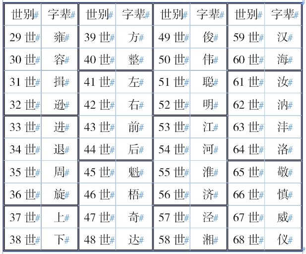二、四十代以后,經(jīng)過(guò)一千多年的繁衍生息,胡氏族人已遷徙分布在全國(guó)各地,排班用字則由各地族人自行往下接續(xù)。