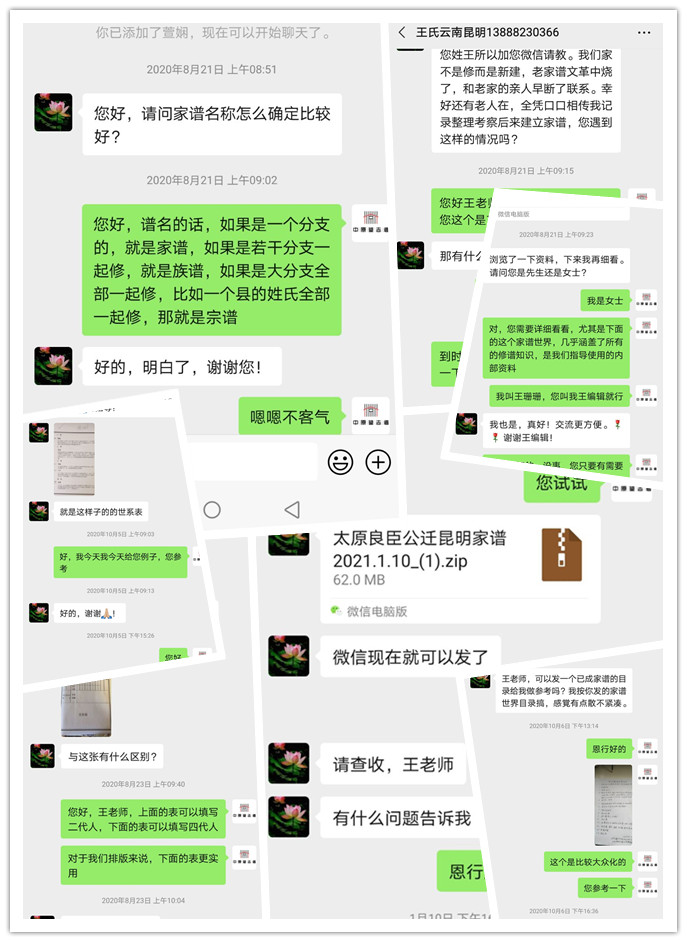 本譜主要是和云南昆明王氏宗親主編:王榮周和王惠萱共同完成,錦秋文譜主要是和惠萱于2020年8月21日開始進行溝通指導(dǎo),從譜名的確定,到指導(dǎo)資料的發(fā)送,后續(xù)入譜人員資料的確定。所有人的流程細節(jié)王老師都非常的謹慎,作為家族中的女兒,對資料內(nèi)容非常的慎重,歷經(jīng)4個月的資料整理搜集和確認,于2012年1月份最終定下來,中間和王老師經(jīng)過了無數(shù)次的溝通和交流,對王老師認真負責(zé)的態(tài)度也非常的感動,希望王氏宗親后代子孫身體健康,越來越好!以下是和客戶的微信溝通交流記錄:
