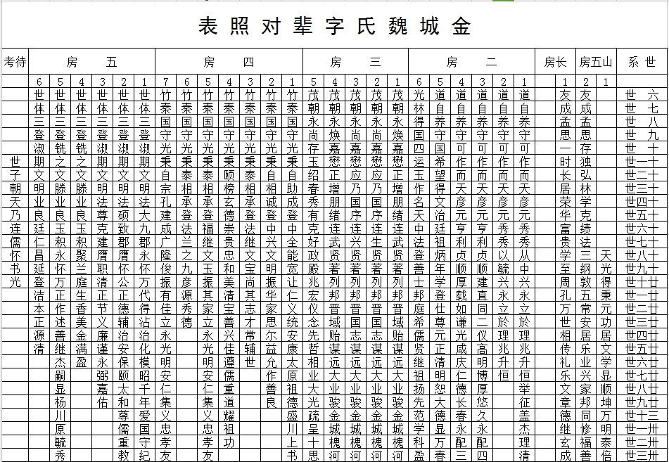(備注:以上金城魏氏四房23世至54世新續(xù)字輩,字意筆劃合天格、人格數(shù)理,合五行生克制化之要領(lǐng),