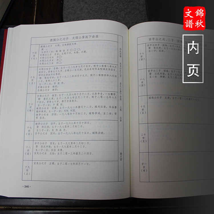 三、本譜設置一套(上、下卷),由卷首、正文(世系表)和附錄三部分組成。上卷置序頁、譜例、譜序、源流考和文廷系世系表等內(nèi)容。下卷置起廷系、貴廷系世系表、人物傳、藝文、老家譜節(jié)選內(nèi)容、功德榜和附錄等內(nèi)容。本譜除依照傳統(tǒng)修譜體例格式編目外,還按現(xiàn)代修譜格式,增設人物傳、藝文、大事記、老家譜內(nèi)容節(jié)選和功德榜,在附錄里增設族事活動集錦,刊載宗親聚居區(qū)全貌圖和大額捐款宗親全家福照片。為方便查閱,下卷亦設總目錄和索引表。