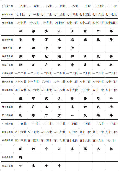 輩字譜在譜藤學(xué)上又稱【行第】。借以標(biāo)明其人所屬宗族和其在族內(nèi)世序先后高低,使之在千支百派紛紜復(fù)雜支裔中各人地位不至顛倒混亂。故各宗族內(nèi)部皆定有華字。然而,我系族大人繁,輩字尚未統(tǒng)一,給辦事、交流帶來諸多不便。鑒于一些實際原因,避免弊端,實有擴(kuò)大輩字范圍之必要。經(jīng)商定,將原從明道祖十三世起,采用的“四十八”個統(tǒng)一輩字書于其下,望各脈在添丁起名時,盡量遵照執(zhí)行,但不強(qiáng)求。另因【源推其業(yè)】中的【推】字不便起名,故將【推】字?jǐn)M【孟】字,與【推】并用。望族人起名時自行選擇。同時將廣平伯符祖、新安元譚祖、嵩縣明道祖、黃彬晉卿祖、郭賽州租和趙樓志道祖、遠(yuǎn)方開基租支系輩字譜書于其下,以仿對照。