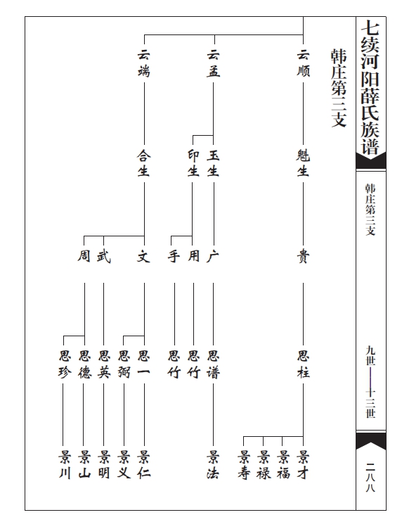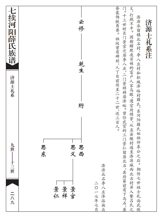 敬覽族譜,悉知先祖志宏乃仲皋公之后。「孟縣緱村是我族之祖居」當(dāng)年先祖曾言之鑿鑿。而綿延至今的闔族子孫、亦銘記于心,未敢須史忘記。惜《河陽(yáng)薛氏族譜》上,并不見載我之一支、遂使北社薛氏后人,頓成無(wú)源之水。每念及此,憂慮之情刻刻不能去懷。幸聞河陽(yáng)薛氏七續(xù)族請(qǐng),倘趁此時(shí)歸宗補(bǔ)入,北社一支將股穆明晰,后世之人亦再不會(huì)留有憾事。故而十八世孫至中、至營(yíng)倡議,十九世孫國(guó)周整理甄別資料,與河陽(yáng)薛氏原辯族譜對(duì)接,終于一脈相承,濟(jì)濟(jì)一堂,同宗共祖,其樂何及!奈具體操辦之人水平有限,雖朝乾夕惕仍難免遺漏訛誤。不當(dāng)之處,尚希有識(shí)之士指正,也待后人踵事增華十九世孫承建謹(jǐn)識(shí)