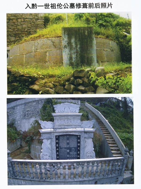 清康熙三年,我始祖相公于茅壩楊柳井龔家溝戰(zhàn)歿殉國(guó),其愛馬“黔寶”將他駝到茅壩平橋白灘子,馬即累死。相祖即葬白灘子,馬埋相祖墳側(cè)(現(xiàn)已失蹤無(wú)考)。倫祖落業(yè)茅壩,卒于八十二壽,于相祖并列同向葬白灘子,坤山艮向。自此,我入黔始祖?zhèn)愊喽嵩诿纹綐虬诪┳?,同享山環(huán)水繞、風(fēng)光綺麗之寶地。先祖安葬后,大約在第六或第七代曾經(jīng)為祖人包墳樹碑(一九八一年翻挖祖墓時(shí)曾發(fā)掘出殘碑?dāng)?shù)塊,當(dāng)時(shí)經(jīng)商定埋入兩祖墓之墳陰溝暫存,二零二零年再次修墓時(shí)重新挖出并進(jìn)行了辨認(rèn),上書后嗣名單至“登”字輩)。