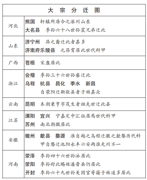 雍正壬子,仁表公二十七世孫武寧伊山淳輝敬錄。予查吾族名支譜,自文王而下其歷代遷徙所載不甚詳晰,囊深以為憾。今得昌水西譜頭,自軒轅以至季孫作都作邑岡紀(jì)分明,而自季孫以下仍有遺漏,子復(fù)得徽之婺源桃溪譜頭,自滎陽(yáng)云初而后遷徙天下凡三大派所載世系省郡詳明。喜愜素懷,謹(jǐn)依舊圖式樣布刊於左俾閱者知某祖某代遷徙何處,并識(shí)各省潘氏大有人在,尺幅萬(wàn)里-刻千年,真尋源溯流之美觀也,愛(ài)記之大宗分遷圖。