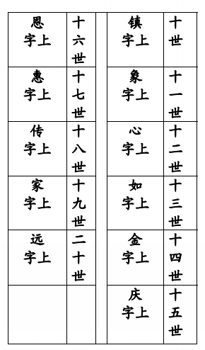 注:由于家譜失傳,二世至九世輩行字失諱,自十六世無考,經(jīng)十三世諱如舜、如海等斟酌,擬定后續(xù)五代輩次。