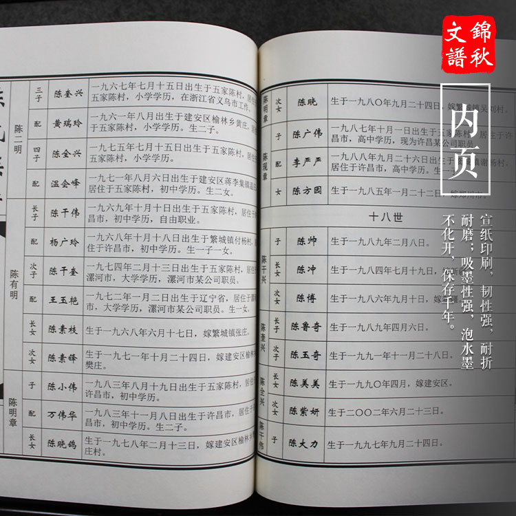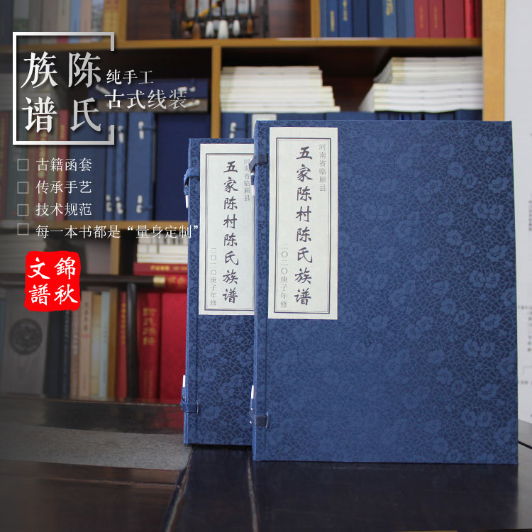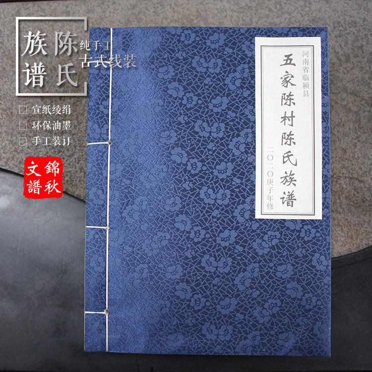 五家陳村陳氏族譜于二0二0庚子年修,由錦秋文譜家譜編印中心負責排版印刷,開本采用線裝十六開大闊本,紙張選用一級宣紙。下面是陳氏族譜的一組圖片: