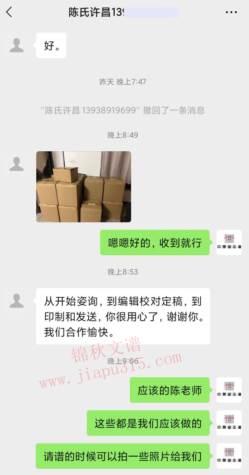 客戶收到族譜驗(yàn)收后,陳氏編修族譜委員會(huì)會(huì)長(zhǎng)給錦秋文譜王編輯發(fā)來了感謝,陳氏宗親說,從開始咨詢到編輯校對(duì)定稿,到印制和發(fā)送,你很用心了,謝謝你,合作的非常愉快。