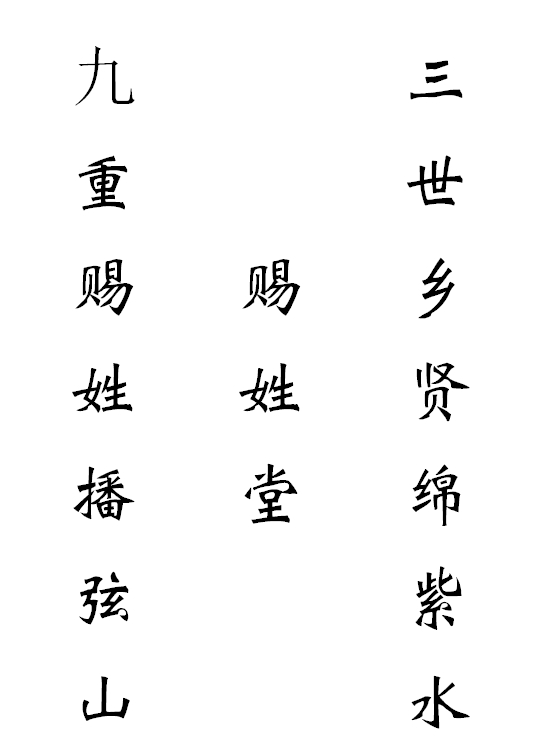 賜姓堂的堂聯(lián)出自何人之作,由于年代久遠(yuǎn),無從可考。此聯(lián)內(nèi)涵精辟、言近旨遠(yuǎn)。以其嚴(yán)密的對仗、平仄、聲韻自成一體,族中廣泛流播。