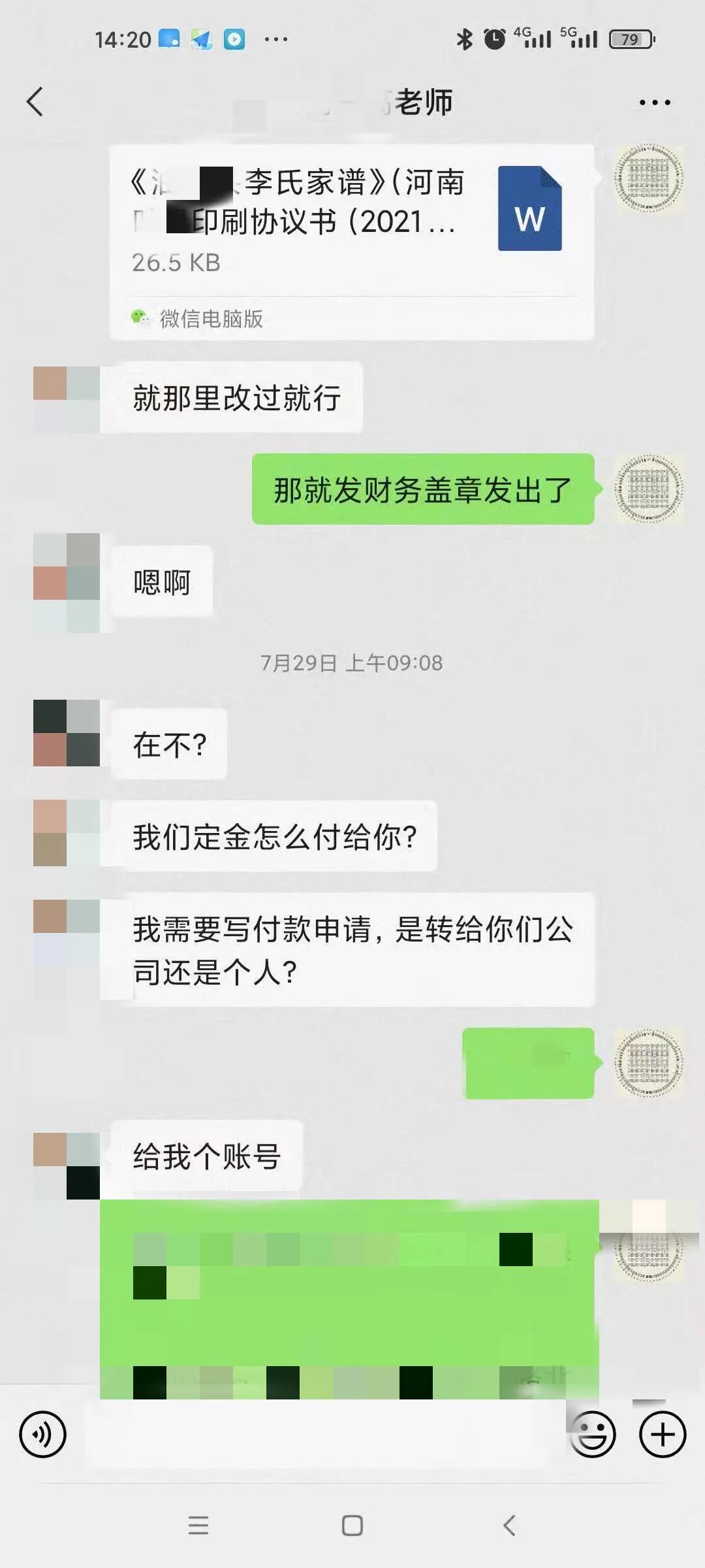 聯(lián)系上時孫老師就將家族資料發(fā)給趙編輯,在此后的時間內(nèi),雙方就家譜編修的一些細(xì)節(jié)進(jìn)行了溝通和商討,趙編輯在將孫老師家族資料做修改,在保證質(zhì)量的條件下發(fā)給對方后,讓孫老師打消了最后一絲編修質(zhì)量顧慮,也讓孫老師對趙編輯的專業(yè)性表示了認(rèn)可。