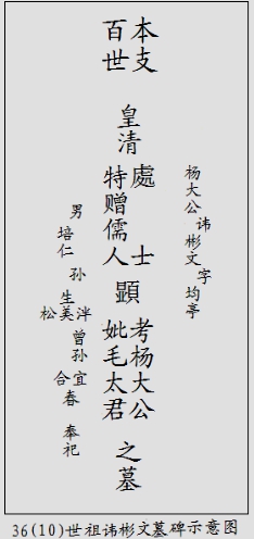 該門第六支系祖墳還立有36(10)祖諱彬文夫婦的墓碑,是我村存下來的兩亭古碑之一(見譜首彩頁)。其字跡已模糊不清,立碑日期一點也看不出來,為后人了解碑文,此將其示意圖附此: