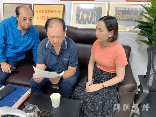 在參觀之后,齊坐辦公室。劉氏宗親查了眾多的家譜樣書資料,和自己家的家族成員信息進行對比參照,最終找到適合自家的排版方式:圖表結(jié)合式。