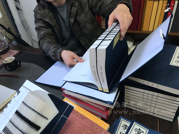 在溝通中了解到,王老師最近在編輯三槐堂禹州王氏家譜,過來學習學習。焦編輯拿出了線裝、精裝不同家譜制作種類的樣書給王老師做參考。在看樣書過程中,王老師提出了自己的疑問:“書號有什么作用?”