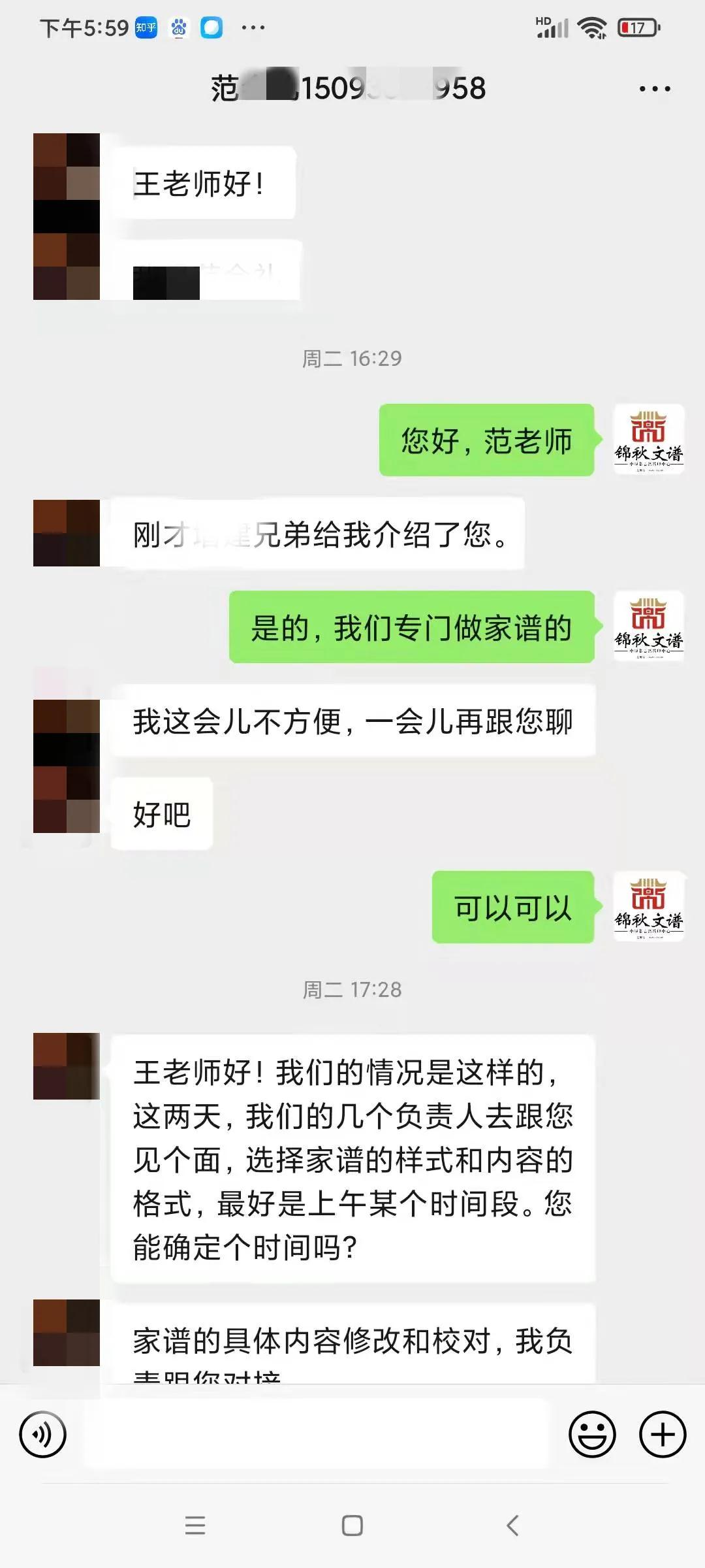 來自河南的范氏家族,在朋友的介紹了解到錦秋文譜,并與錦秋文譜取得了聯(lián)系,經(jīng)過溝通,錦秋文譜清楚范氏宗親對(duì)于家譜有著很高的要求,不管是家譜紙張還是家譜裝訂工藝,都是非常注重并謹(jǐn)慎的選擇家譜機(jī)構(gòu),但有著朋友的強(qiáng)烈推薦下,范氏宗親隨即便決定來到錦秋文譜進(jìn)行實(shí)地考察。