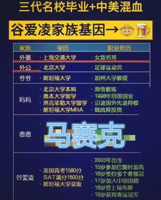在所曝光的谷愛凌一家三代“家譜”中,谷愛凌的爺爺是畢業(yè)于斯坦福大學(xué),她的父親則是畢業(yè)于哈佛大學(xué),谷愛凌的外公外婆也是畢業(yè)于北大和上海交大的高材生,而谷愛凌的母親本科則是在北大就讀,后又去斯坦福留學(xué),可見谷愛凌在學(xué)業(yè)和學(xué)習(xí)滑雪的成功,跟家族基因有著直接關(guān)系,有著普通人不可比擬的先天優(yōu)勢。