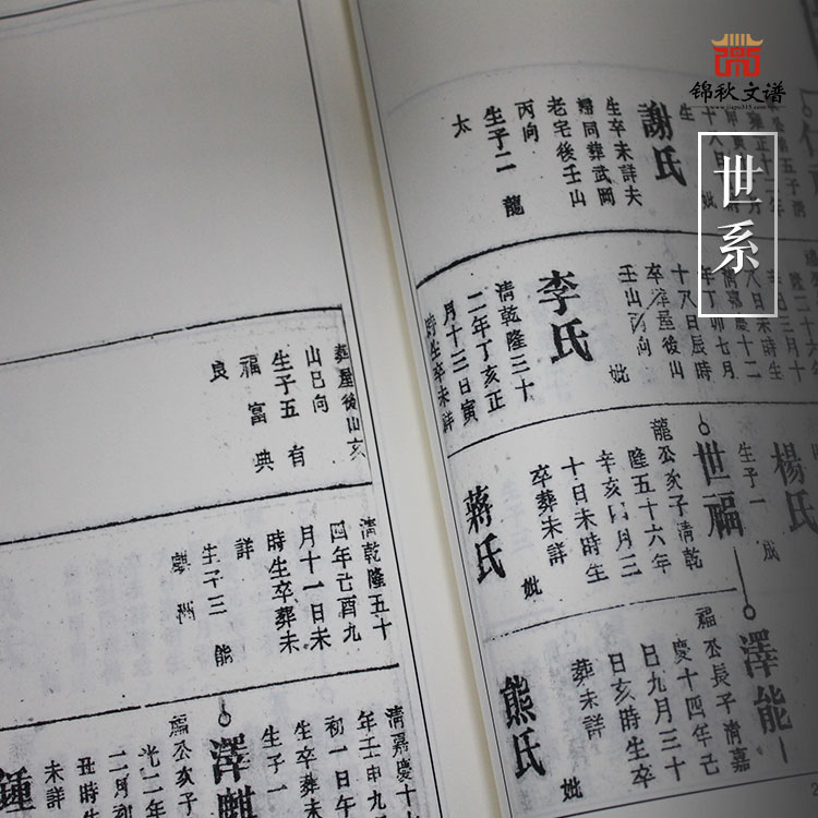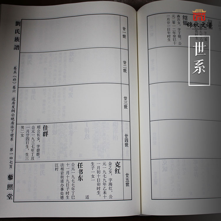 一、原譜乘范仍舊沿用,既合時(shí)宜又示好古之意,與時(shí)俱進(jìn),富含時(shí)代氣息。傳承老譜的世系格式,五代起行,電腦制版,膠印精裝,卷五、卷六暫合裝。名號(hào)之下書寫內(nèi)容:今人注明出生年月日時(shí),畢業(yè)學(xué)校、工作單位、職務(wù)、職稱;亡者注明卒年月日時(shí),葬所暢名,山向。女參與者,按男丁記錄外,猶需注-適xx(夫名),住址、出生年月日時(shí)。直系祖輩從鼻祖賞衿公至澤字輩共計(jì)二十代,世系表從老譜中摘錄出來,原譜中的譜序、族中概況、族規(guī)、族禮等體現(xiàn)我族人文歷史的文頁內(nèi)容,也有所舍取,摘錄部分與今次續(xù)修合成一冊(cè)。二、稠樹塘鎮(zhèn)雅槎村劉氏因地域毗鄰,此次與清水亭劉氏合修。因?yàn)槲覀兺瑢偕哿曜谧澹?,合修十分便利?/span>