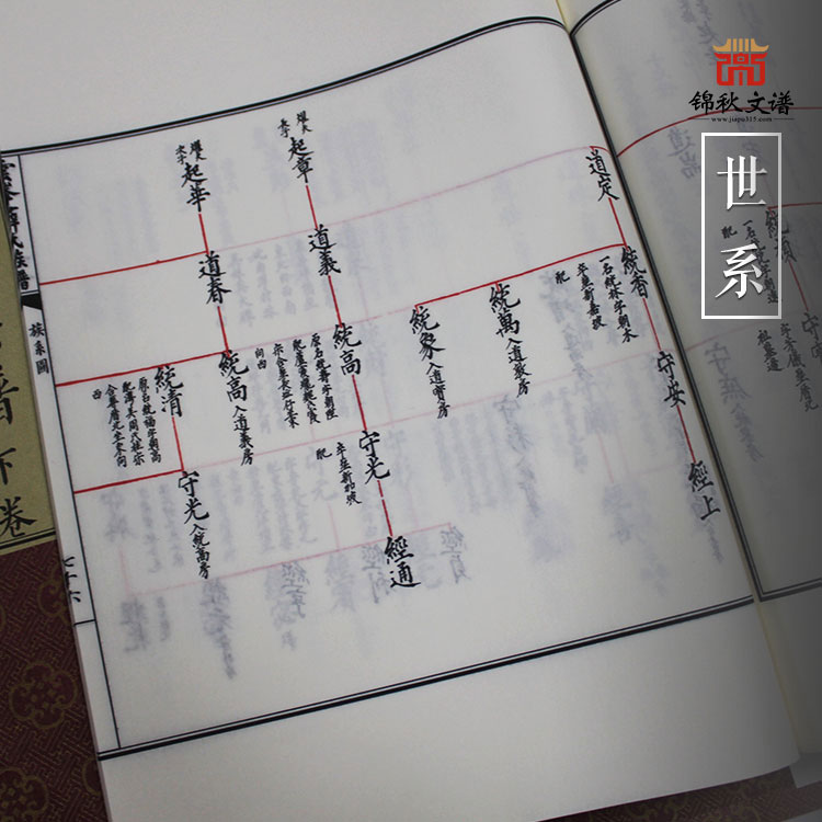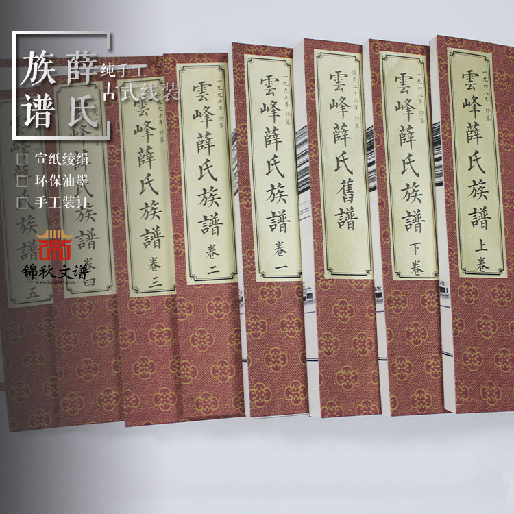 日前,由錦秋文譜中華家譜館負(fù)責(zé)承印的《云峰薛氏族譜》已成功交付。該譜全部為老譜修復(fù)影印版,版本分別為:一九四八年修纂的《云峰薛氏族譜》上下兩卷,單本道光二十六年修纂的《云峰薛氏族譜》,一九九七年修纂的五卷《云峰薛氏族譜》。三個不同版本全部采用古式線裝右裝訂的方式。韓錦布料的選用利于族譜長久保存。在開本上,沿用了老譜的1:1還原尺寸,美觀典雅大方。