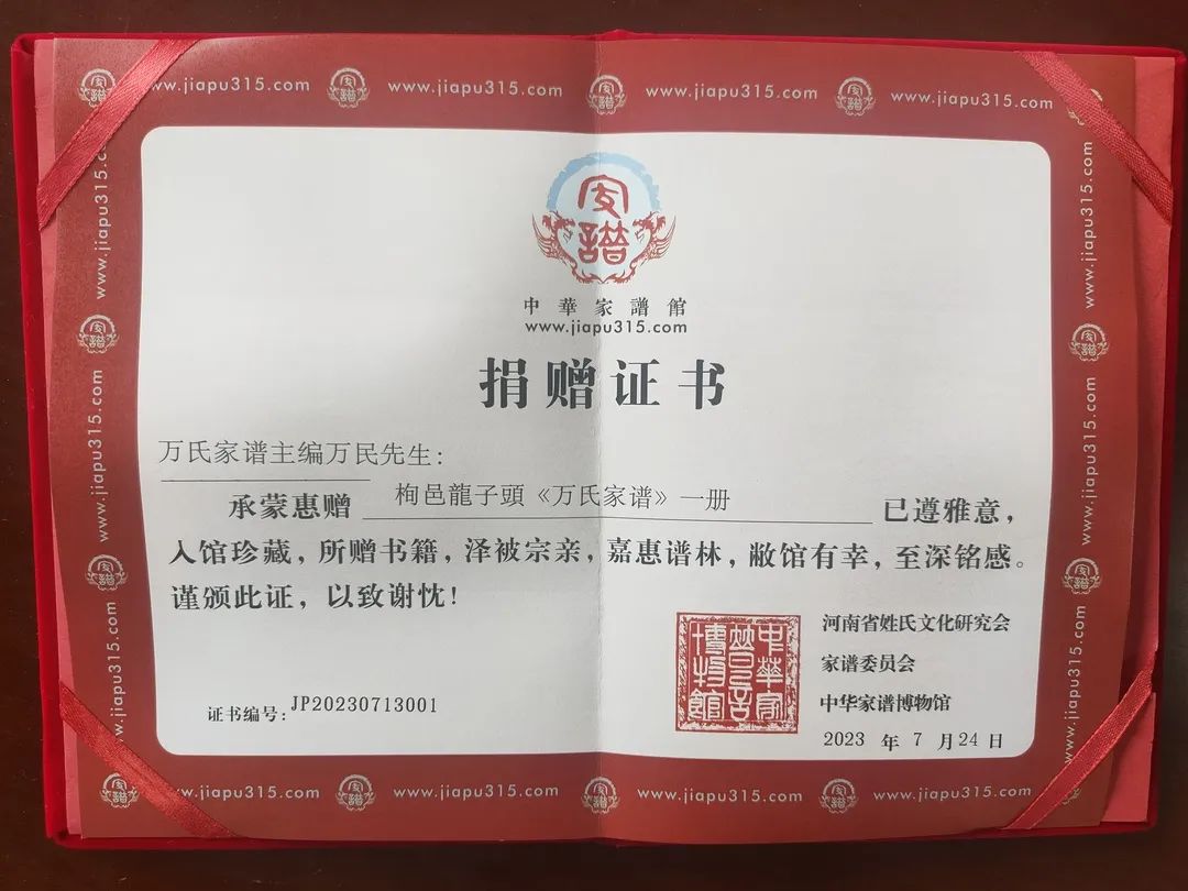 日前,陜西旬邑縣的萬民先生向我館捐贈了一冊《旬邑龍子頭萬氏家譜》。我館接受了饋贈,并向萬老師回寄了收藏證書。